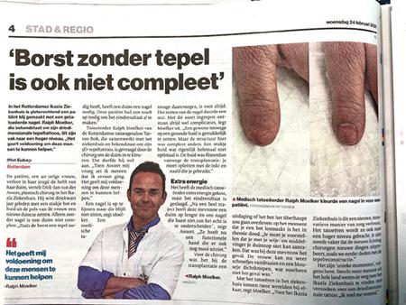 Mijn naam is Ralph Moelker, ik ben o.a. werkzaam in het Ikazia ziekenhuis te Rotterdam. Vanuit daar breng ik voor vele ziekenhuizen tepelhof pigmentaties en medische/cosmetische pigmentaties uit. Als zoon van de kunstenaar/tattoo artiest "Tattoo Bob" in Rotterdam ben ik opgeroeid met de kennis van het tatoeëren. Met mijn vader als leermeester heb ik mij vervolgens ontwikkeld tot specialist op het gebied van pigmenteren. Omdat er altijd nieuwe ontwikkelingen zijn op het gebied van tatoeages waren hier richtlijnen voor nodig. Ik heb, samen met de GGD Rotterdam, een adviserende rol gehad in het ontwikkelen van deze richtlijnen op zowel landelijk als Europees niveau. Inmiddels heb ik een eigen medische cosmetische kliniek genaamd TB Medical. Hier voeren wij verschillende behandelingen uit zoals medische pigmentaties, litteken behandelingen, tepelpigmentaties, micro haar pigmentatie, huidverbeterende behandelingen waaronder pigmentatie problematiek, rosacea, couperose en overbeharing. We zijn trots dat wij in Nederland behandelingen zoals o.a. micro haar pigmentatie, tepelpigmentatie, permanente maken up op de kaart hebben gezet.