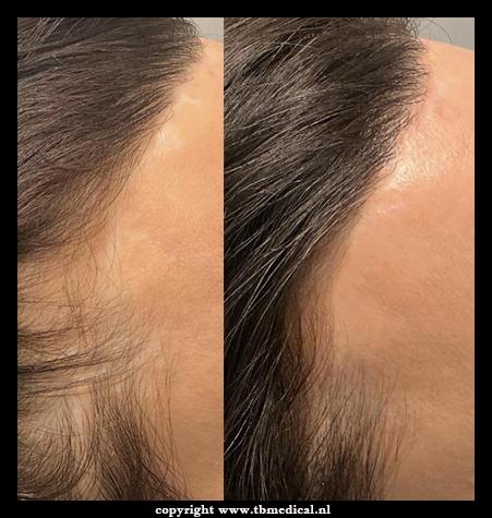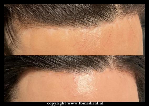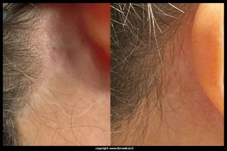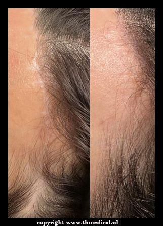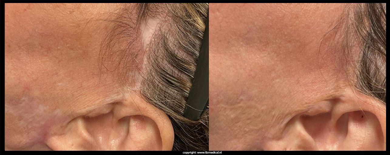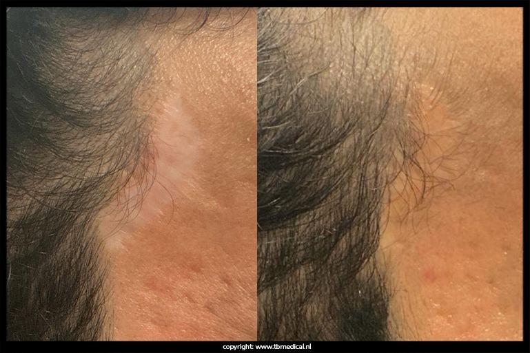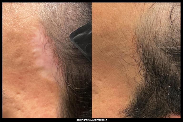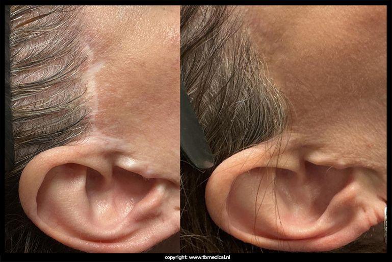 - Littekenvorming in de haarlijn of halsregio