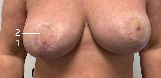 Op deze foto is te zien hoe we de eerder verkeerd geplaatste tepel visueel hebben laten opgaan in de nieuw aangebrachte, correct gepositioneerde tepel.