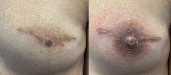 Wij hebben de rechterzijde kunnen corrigeren door het litteken optisch te egaliseren en de pigmentatie subtiel aan te passen, waardoor de littekenvorming vrijwel niet meer zichtbaar is. Aan de linkerzijde hebben we met behulp van optische illusie de tepel op de juiste plek gepositioneerd en opnieuw aangebracht, met een natuurlijk en symmetrisch resultaat als einddoel.